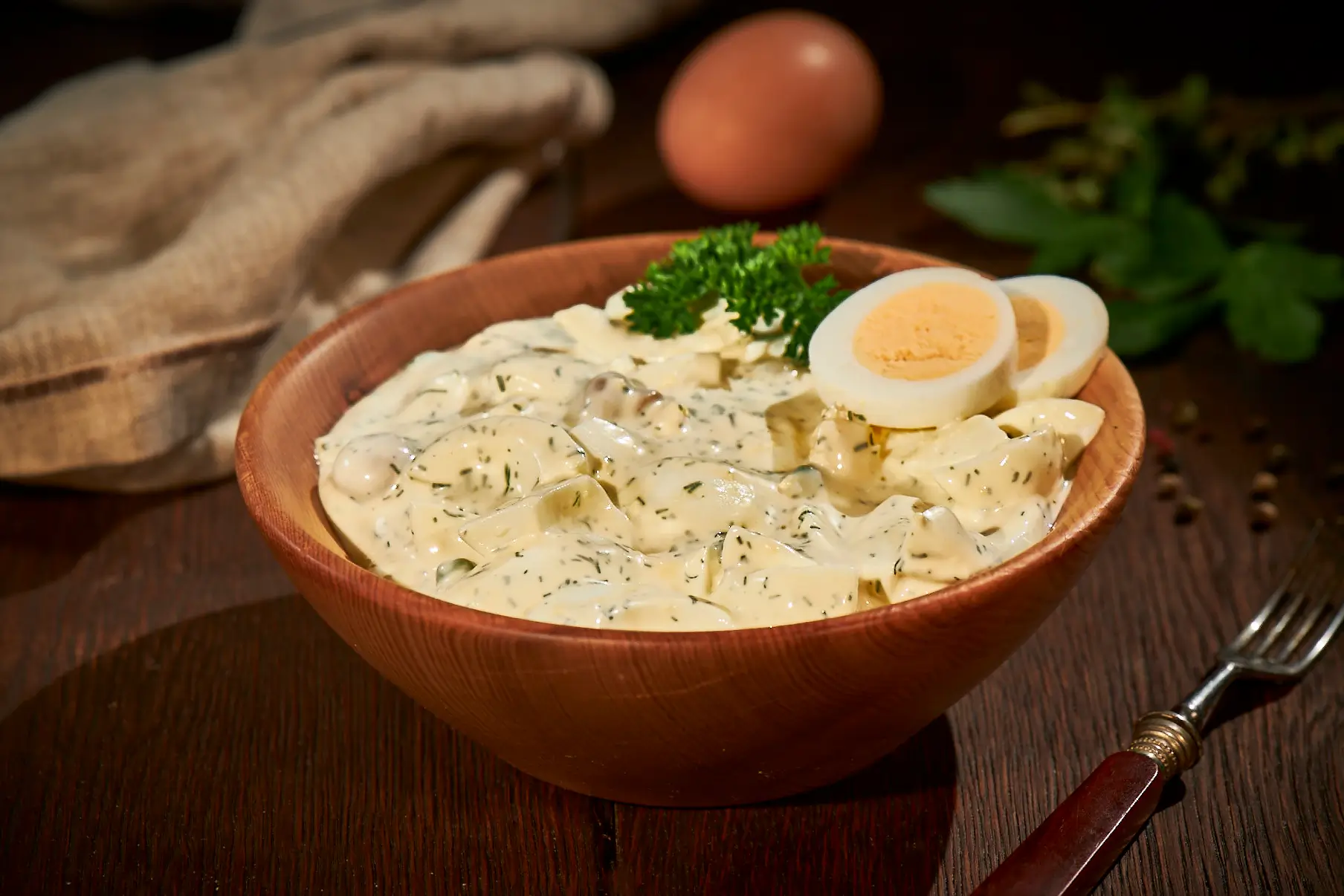 Eier und Gurken in feine Würfel schneiden, den Knoblauch schälen und pressen und alles mit den anderen Zutaten in einer Schüssel vermengen. Wer am nächsten Tag nicht so sehr riechen möchte, der kann statt Knoblauch auch Bärlauchpesto verwenden. Mit Salz und Pfeffer abschmecken. Zuletzt den Eiersalat mit etwas gehackter Petersilie verfeinern.