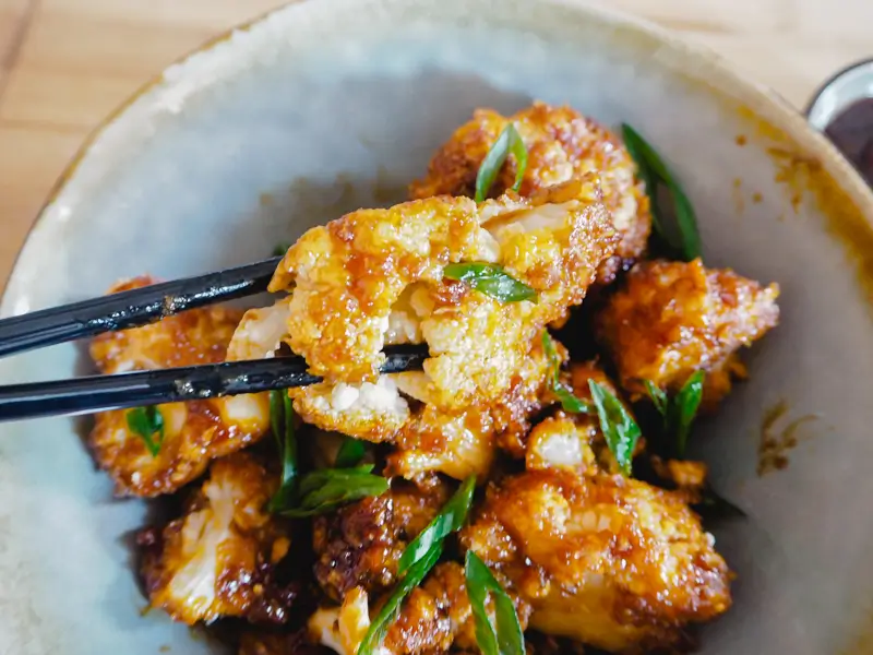 Den Blumenkohl waschen, in Röschen teilen und im gesalzenen Wasser 4-5 Minuten kochen. Das Wasser von den Röschen abgießen und sofort mit kaltem Wasser abspülen.