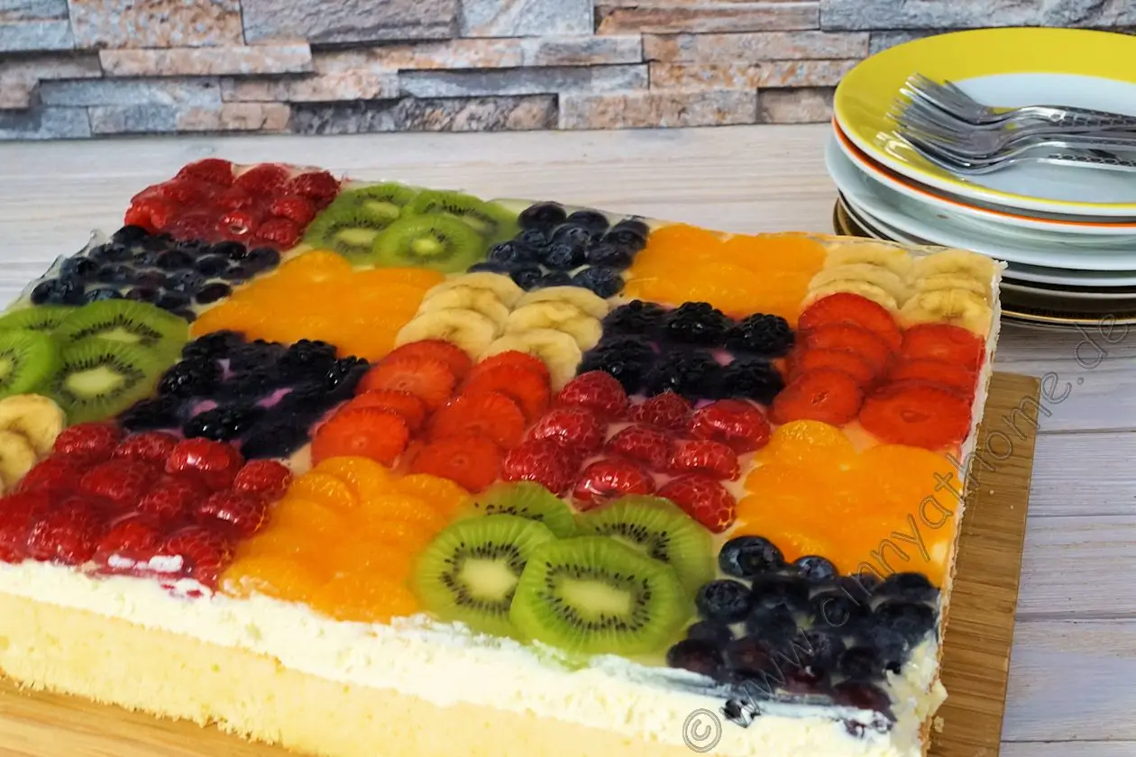 Man kann auch andere Obstsorten verwenden, z.B. Kirschen, Stachelbeeren oder frische Himbeeren.Biskuit auf eine große Platte (Tablett) stürzen, Papier abziehen. Quarkmasse auf dem Biskuit glatt verstreichen. Mit einem Messer in die Creme 24 Stücke (Quadrate 4 mal 6) vorritzen.