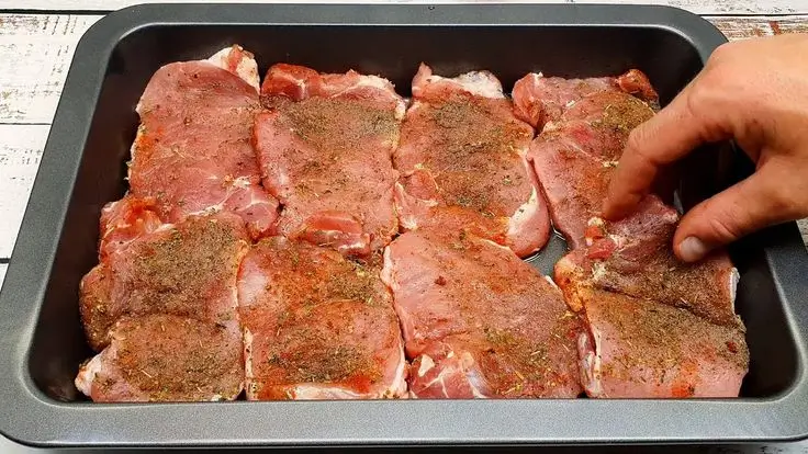 Das gebratene Fleisch zusammen mit ein paar Lorbeerblättern in eine Auflaufform legen. Das Öl in der Pfanne nicht wegwerfen, sondern darin den in Scheiben geschnittenen Knoblauch und die Zwiebel anbraten.