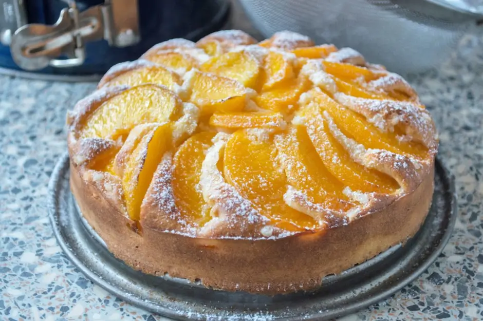 Die Pfirsiche gut abtropfen lassen. Achteln und auf der Masse verteilen. Kurz mit einem Löffel verrühren.