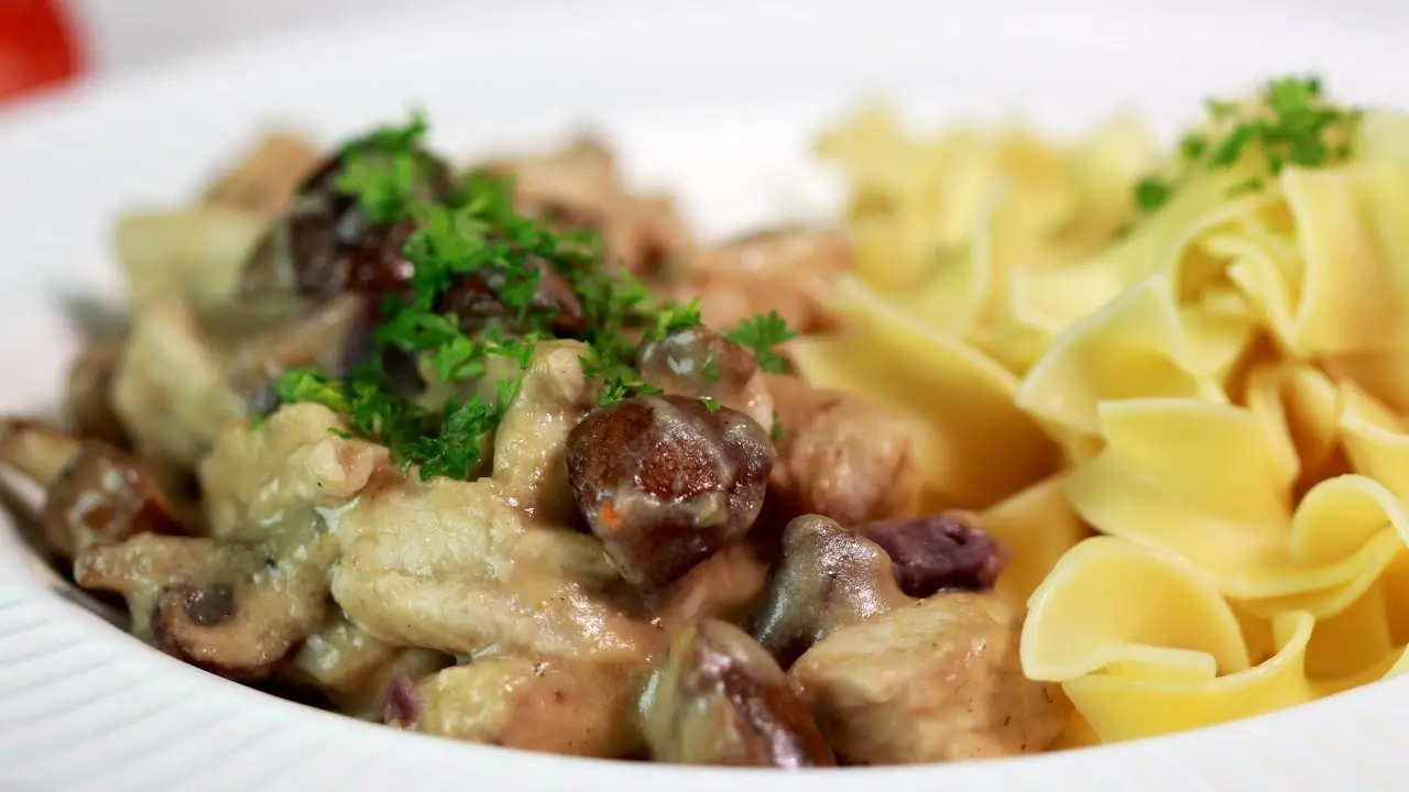 Jetzt das Fleisch aus der Pfanne nehmen und Gemüsebrühe aufkochen lassen. Darin den Philadelphiakäse schmelzen, Champignons und Fleisch dazugeben, etwas köcheln lassen, falls die Sauce zu dünn ist, etwas Saucenbinder dazu und mit frischer Petersilie bestreuen.