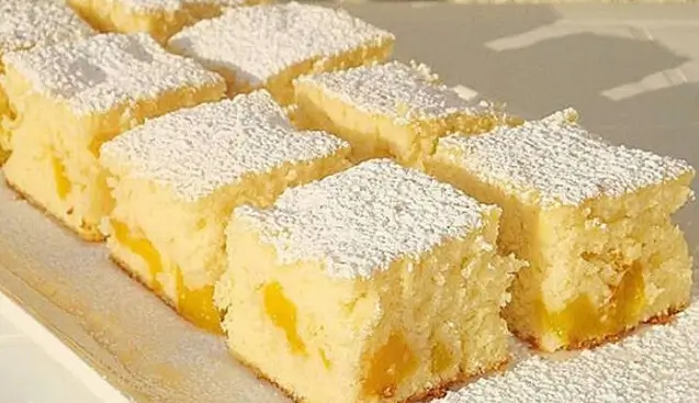 Bei 180°C Heißluft circa 20 Minuten backen. Auf den heißen Kuchen 1 Becher flüssige Schlagsahne träufeln. Kuchen auskühlen lassen und mit Puderzucker bestäuben.