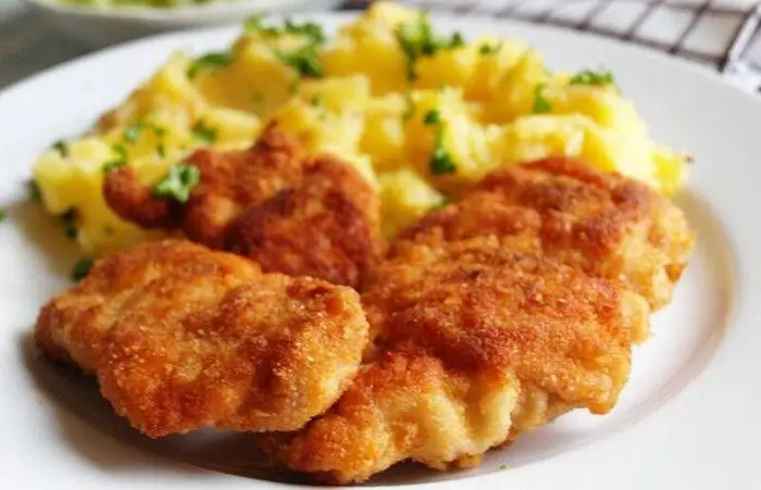 Fleisch in Semmelbröseln panieren und im heißen Öl/Schmalz langsam braten.
