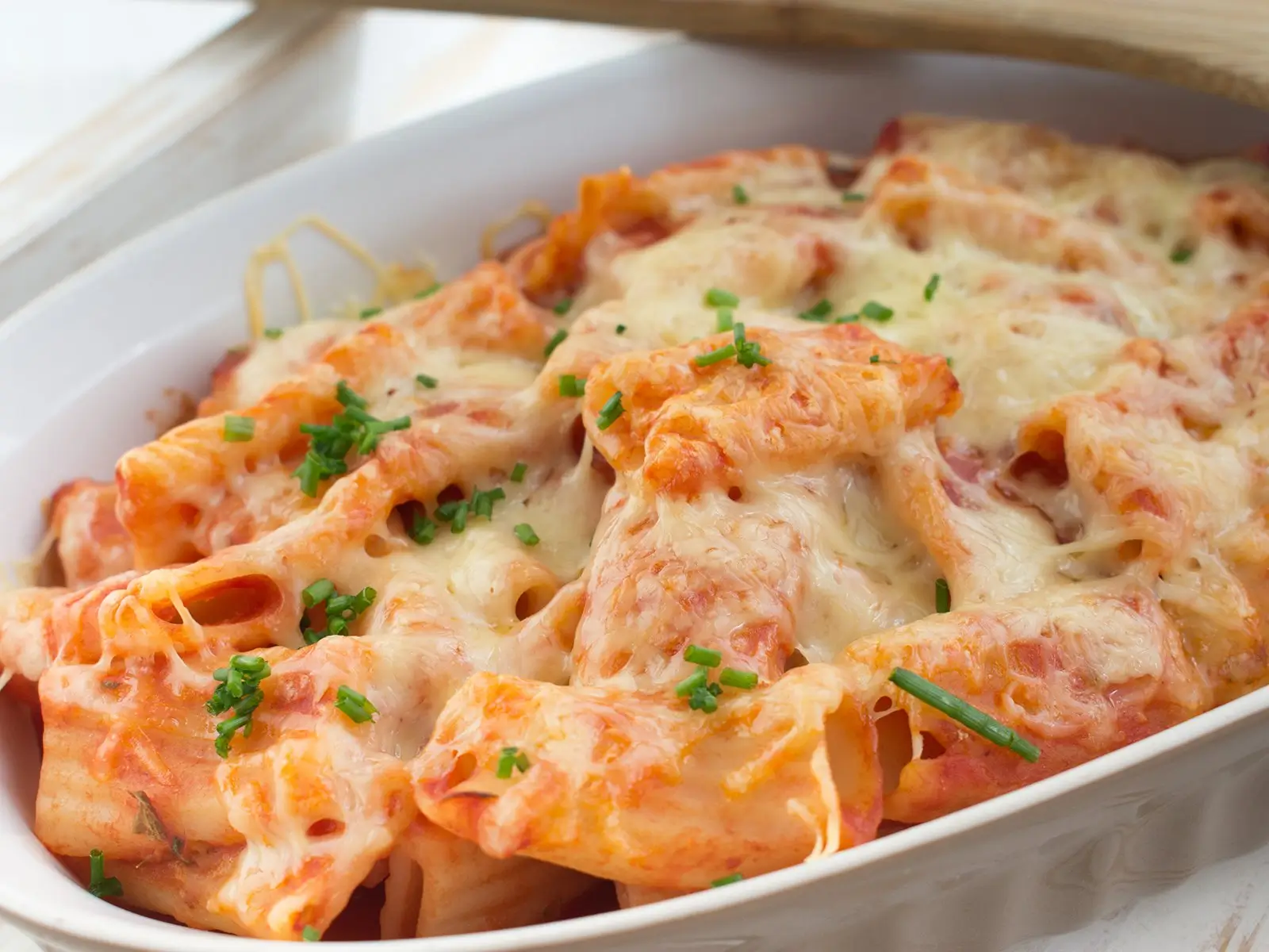 In eine Auflaufform füllen und mit Käse bestreut 20 Minuten überbacken.
