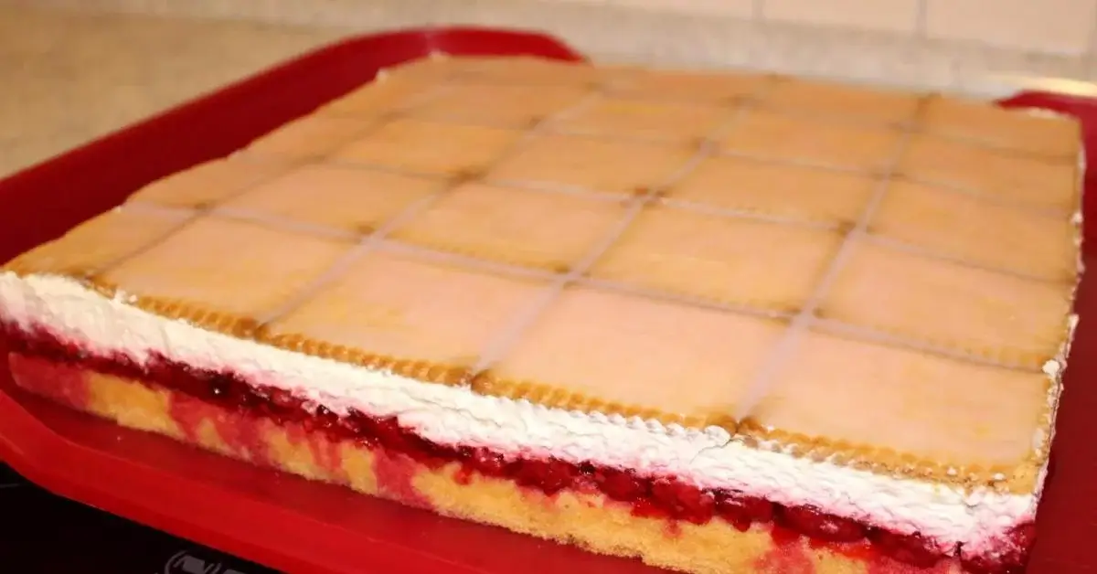 Jetzt die Preiselbeeren auf der Oberfläche des Biskuitkuchens gleichmäßig verteilen. Die Sahne mit Sahnesteif steif schlagen und damit den Kuchen bestreichen. Die Butterkekse einzeln kurz in den Rum tauchen, anschließend gleichmäßig, dicht und vollständig die Sahne damit abdecken.