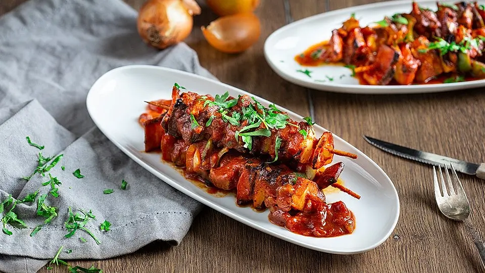 Dann ca. 10 Minuten etwas reduzieren und die Schaschlik-Spieße hinzugeben. 90 Minuten auf kleinster Stufe köcheln lassen.