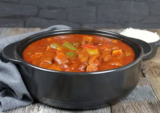 Die Zwiebelmischung ebenfalls in den Topf geben und die Zutaten etwas vermischen. Mit den Paprikastücken möglichst eben abschließen. Aus der Fleischbrühe, dem Ketchup, Curry, Paprikapulver und Knoblauchgranulat eine dickliche Soße rühren. Diese gleichmäßig über die Zutaten geben. Abdecken. Die Schmorzeit beträgt auf höchster Stufe (HIGH) ca. 4 – 5 Stunden, auf mittlerer (MEDIUM oder AUTOMATIC) 6 bis 7. Wer mag, schmeckt noch mit wenig Salz und Pfeffer ab.