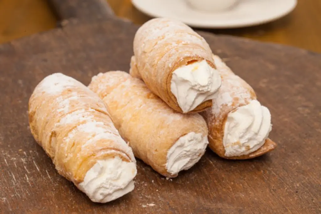 Nun die Eigelbe verquirlen und mit einem Teil davon die Teigstreifen an einem Längsrand bestreichen. Die Streifen dann so auf die Formen rollen, dass der bestrichene den unbestrichenen Rand ein wenig überlappt und die Ränder zusammendrücken. Die Rollen mit dem restlichen Eigelb bestreichen und im Backofen eine Viertelstunde lang backen. Die Rollen noch heiß von den Formen lösen und auskühlen lassen. In dieser Zeit die Sahne mit dem Vanillezucker steif schlagen und die Rollen dann damit füllen. Die fertigen Schaumrollen vor dem Servieren mit Puderzucker bestäuben.