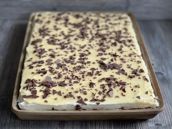 5. Jetzt die Creme langsam auf dem Boden gleichmäßig verstreichen. Als letztes die dunkle Schokolade schmelzen und in unregelmäßigem Muster auf die Eierlikörcreme tröpfeln oder Schokoraspeln obenauf vorsichtig verteilen, und Kühl stellen.