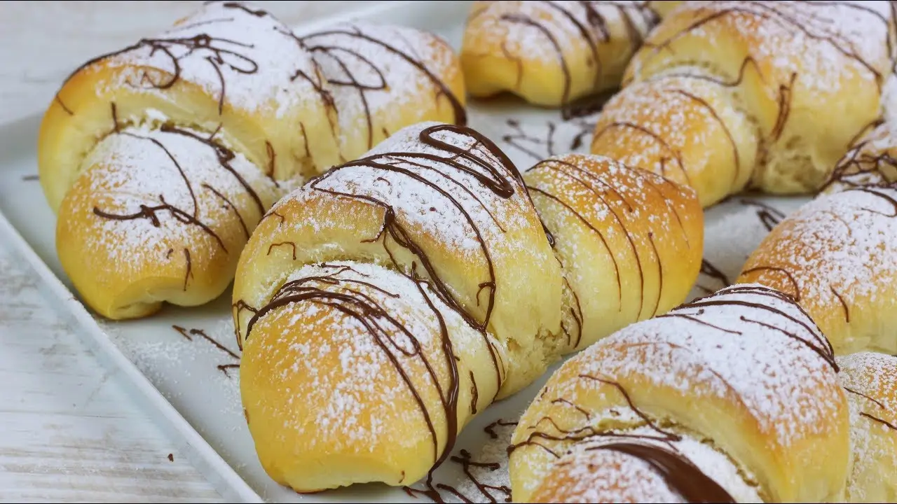 Eiweiß mit Zucker steif schlagen. Bittermandelaroma und Nüsse unterziehen. Die Nussfüllung auf die Teigplatten streichen, mit Hilfe eines Tortenteilers in 16 Stücke einteilen, zu Hörnchen aufrollen und bei 170° C Umluft im vorgeheizten Ofen ca. 15 – 20 Minuten backen.