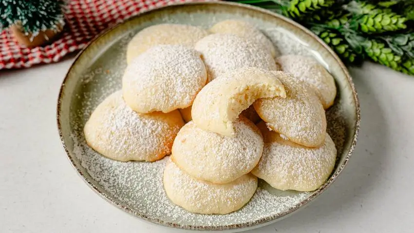 Bei 160 °C hellbraun backen. Die fertigen, noch warmen Plätzchen in einer Mischung aus Puder- und Vanillezucker wälzen.