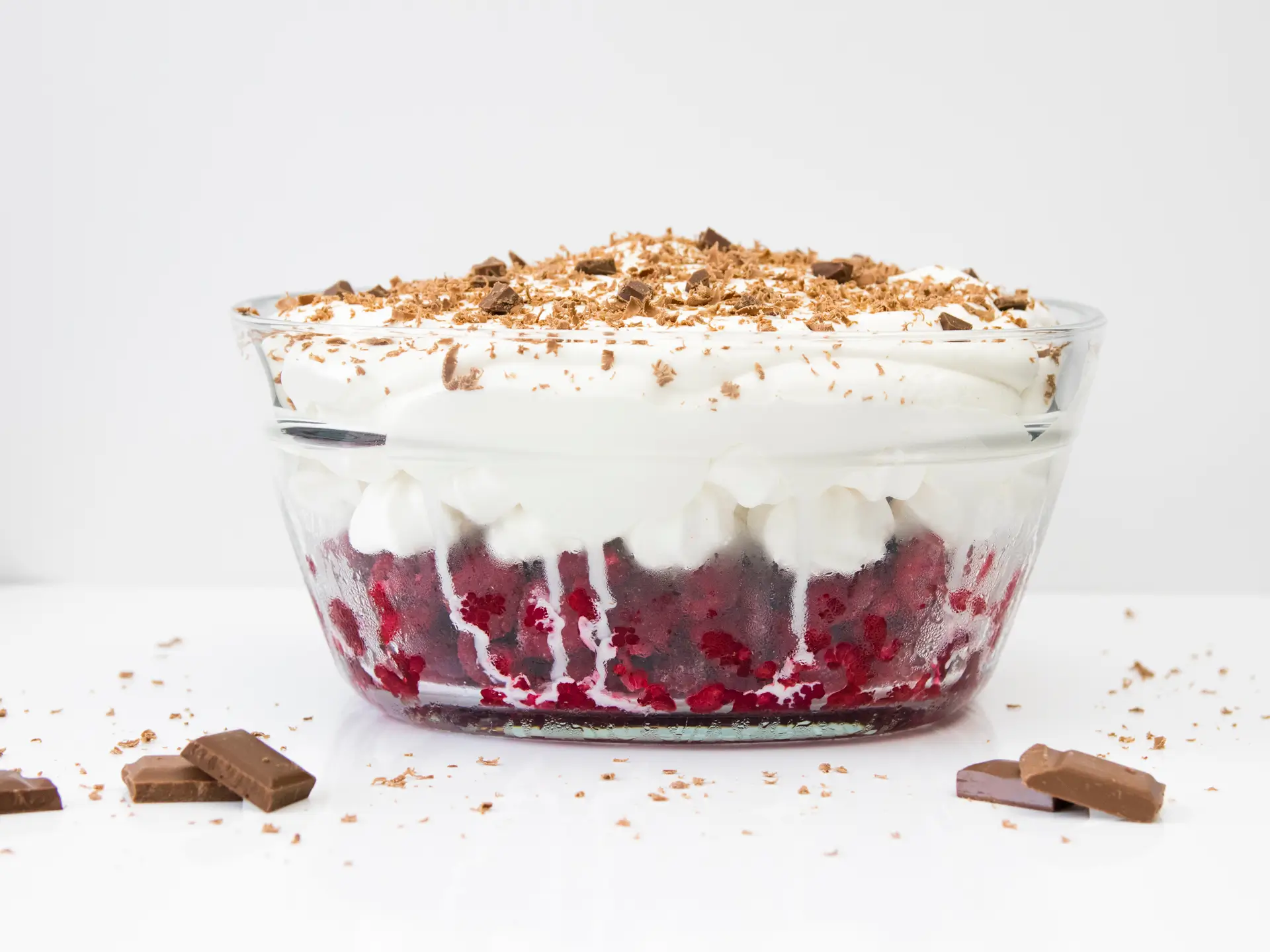 Die Himbeeren in eine Auflaufform (für die gute Optik nehme man eine aus Glas) geben. Bei der Verwendung von TK-Himbeeren, die Himbeeren etwas antauen lassen. Dann die Sahne steif schlagen, die beiden Päckchen Vanillinzucker hinzufügen. Den Naturjoghurt dann unterheben.