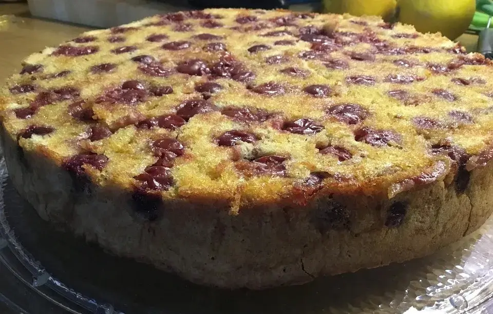 Jetzt den Teig in ein tiefes mit Folie bedecktes Backblech füllen und die entsteinten Kirschen gleichmäßig darauf distribuieren.