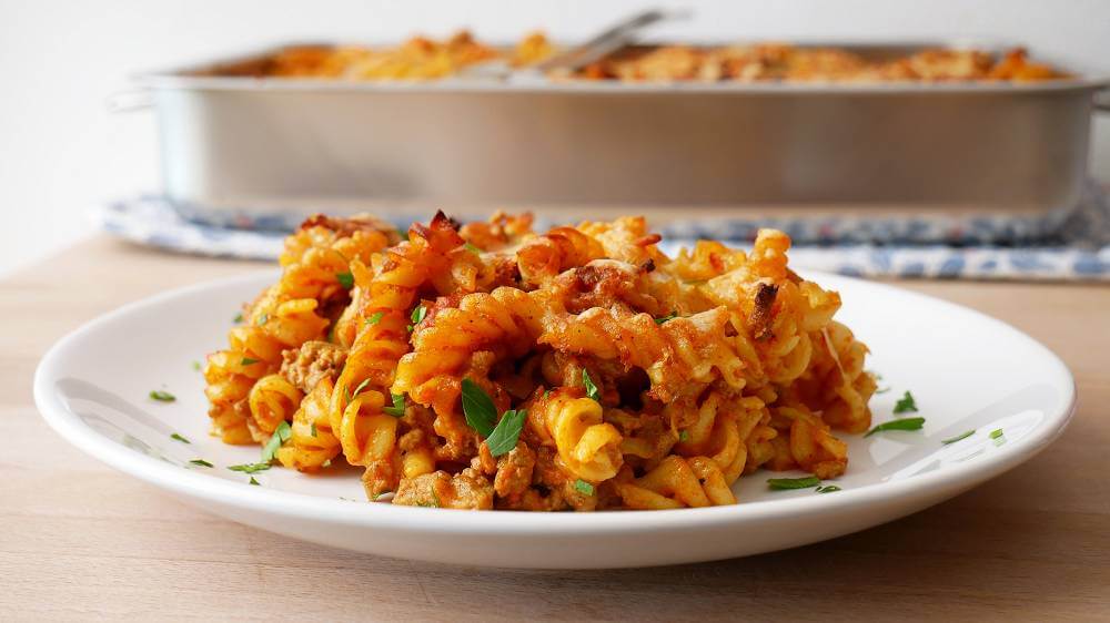 1. Zuerst die Nudeln gar kochen, Hackfleisch mit Zwiebeln, Tomatenmark, Salz und Pfeffer im heißen Fett bräunen, mit den Nudeln in eine gefettete Auflaufform schichten.