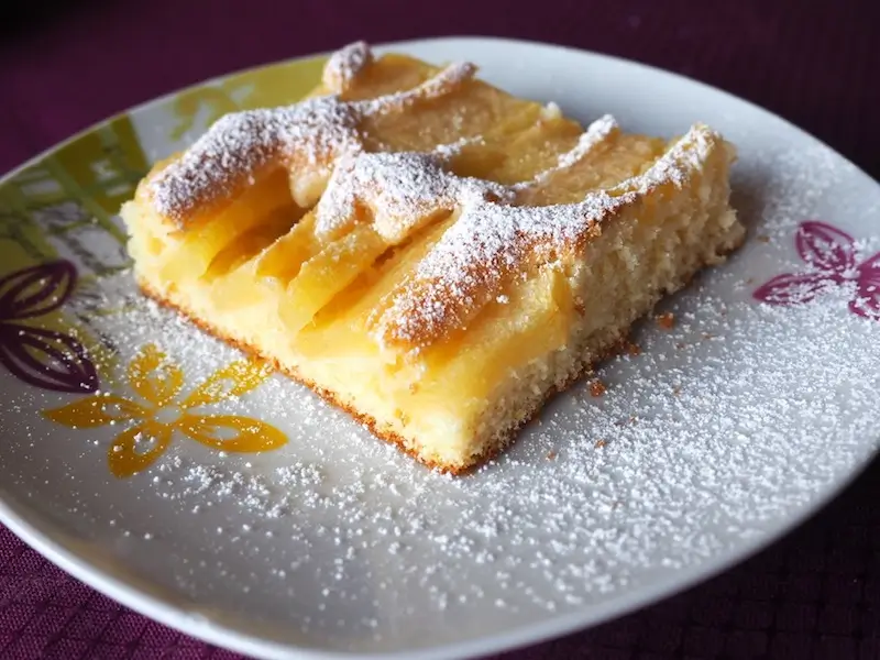 Die Äpfel schälen. 2 Äpfel würfeln, die beiden anderen Äpfel in Scheiben schneiden. Die gewürfelten Äpfel unter den Teig heben. Diesen dann in eine vorbereitete 26er Springform geben. Die Apfelscheiben auf dem Teig verteilen und nach Belieben mit einer Mischung aus Zimt und Zucker bestreuen.