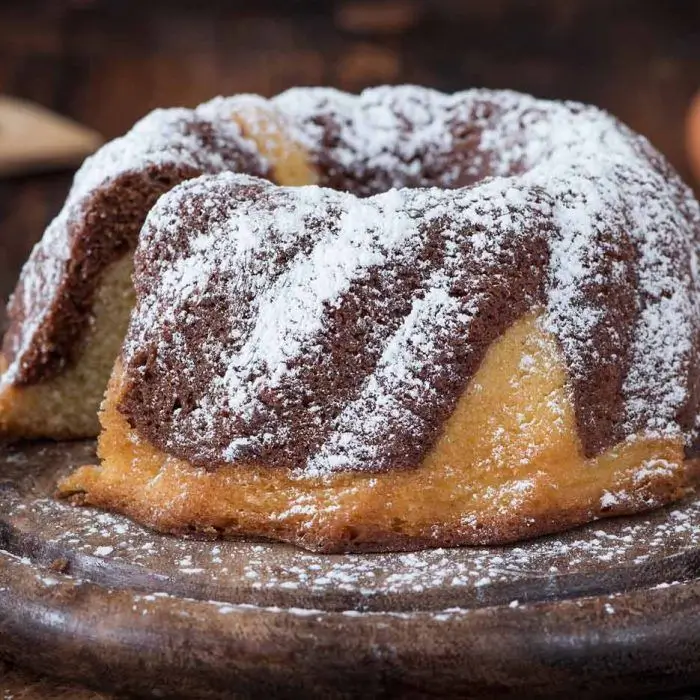 Als nachtes Instantkaffee in ein wenig Wasser lösen und zu der anderen Hälfte des Teigs geben. Rum sowie durchgesiebtes Kakaopulver dazugeben. Gut umrühren und in die Form geben.