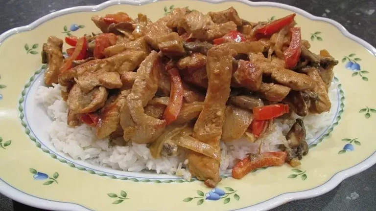 Soße mit Salz und Pfeffer abschmecken. Fleisch zugeben und nochmals in der Soße erwärmen. Schnitzelstreifen anrichten. Reis dazu reichen. Dazu schmeckt Salat.