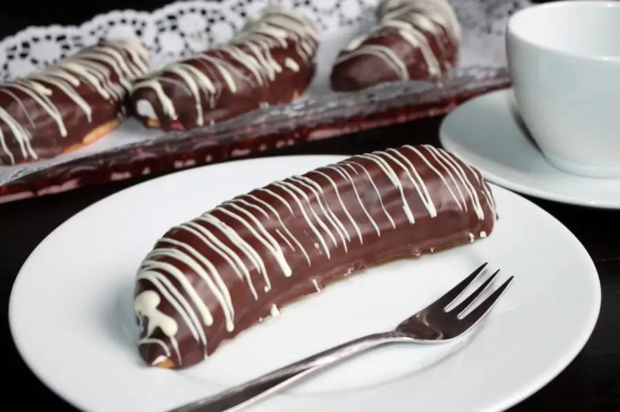 Immer 2 Streifen nehmen die erste mit Creme bestreichen… Die 2 drauflegen… Wieder Creme drauf streichen… Dann die halbierte Banane drauf legen und dann mit schoki übergießen.. Ich habe das mit ner sossen Kelle gemacht …Man braucht ne Menge mind. 3 Becher kakao glasur