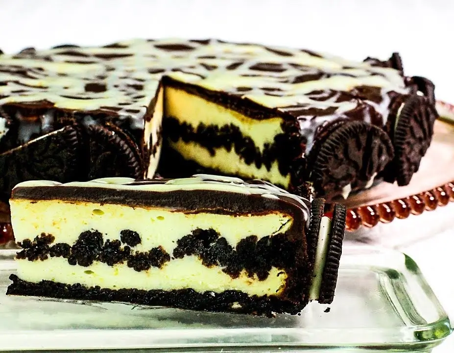 Dunkle Schokolade grob hacken und über einem warmen Wasserbad schmelzen. 70 g Sahne dazugießen und glatt rühren, etwas abkühlen lassen. Mit der weißen Schokolade und 30 g Sahne genauso verfahren. Käsekuchen mit der dunklen Glasur überziehen. Weiße Glasur grob darauf verteilen, mit einem Zahnstocher marmorieren. Rand mit Keksstückchen verzieren und Kuchen ca. 30 Minuten kalt stellen