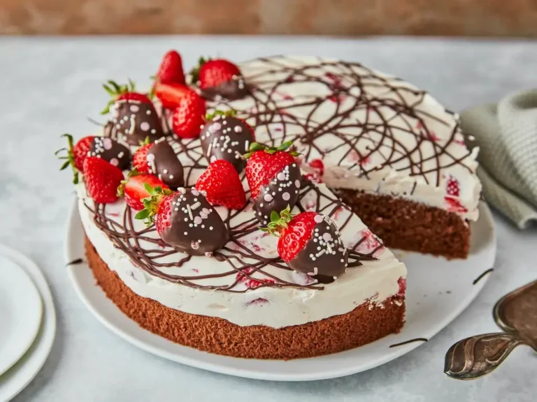 Die Creme auf dem kalten Kuchen verstreichen und mit klein geschnittenen Erdbeeren belegen. Sahne mit Sahnesteif steif schlagen und den Kuchen damit verzieren. Den Kuchen in den Kühlschrank stellen, am besten über Nacht. Danach in Stücke schneiden und servieren. Guten Appetit!