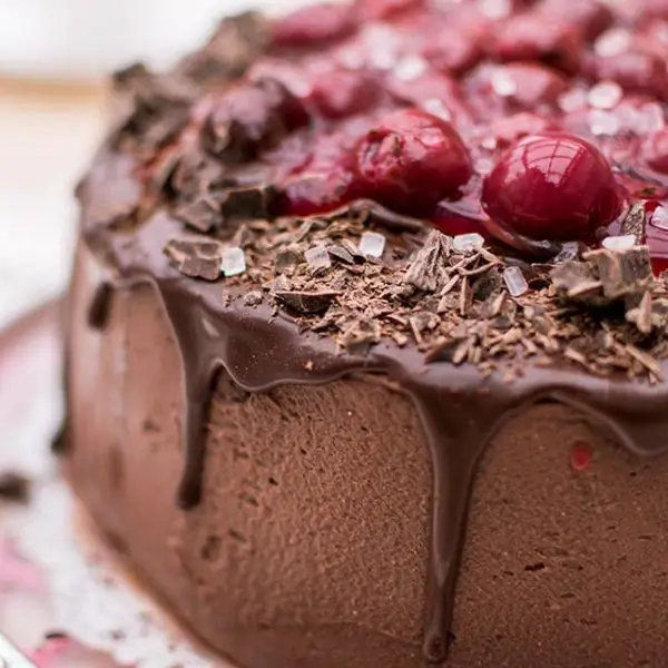 Sahne erwärmen, Schokolade hinzufügen und zu einer homogenen Masse rühren. Die Glasur unter gelegentlichem Rühren auskühlen und etwas dicker werden lassen. Die Torte auf ein Gitter legen und gleichmäßig ganz mit der Schokoglasur überziehen. Das Gitter auf eine Servierplatte oder ein Backblech legen, damit die überflüssige Glasur darauf herunterlaufen kann. Die kann man nämlich nochmal verwenden. Die Torte auf eine Tortenplatte legen und kalt stellen. Da man etwas mehr Glasur hat als man braucht, wird sie auch schön über den Rand laufen und man muss die Tortenseiten nicht mit einem Messer korrigieren. Eventuell kann man die Torte immer an die Seite neigen, dann wird die Glasur noch besser über den Rand runter laufen können.