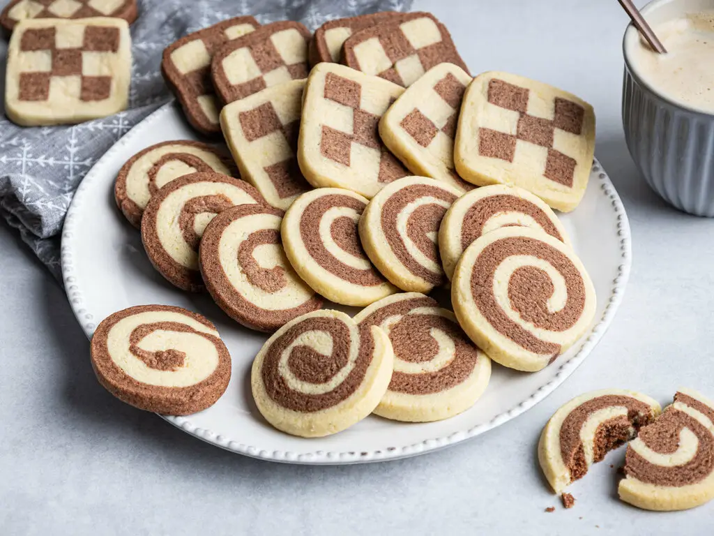 Die weiche Butter, Puderzucker und Mehl miteinander verkneten. Den Teig teilen, in eine Hälfte den Kakao einkneten, bis alles braun durchgefärbt ist. Dann die beiden Teile grob miteinander verkneten, so dass ein grobes Schwarz-Weiß-Muster entsteht.