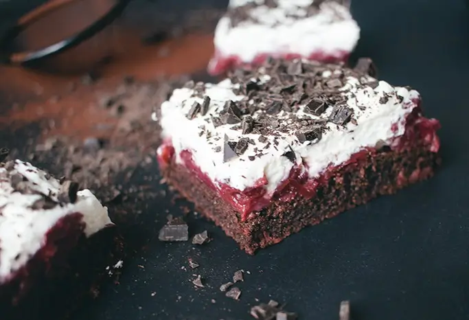 Die Schlagsahne schlagen und auf den Kuchen geben. Mit Schokoladenraspel verziert servieren.