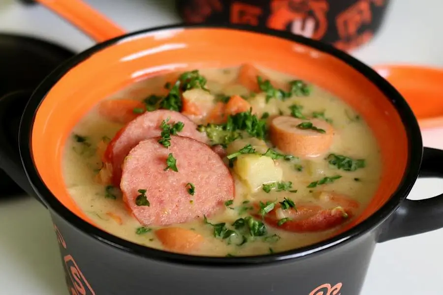 Zum Schluss die Sahne unterrühren, nicht mehr kochen lassen. Die Würstchen in den Eintopf geben und darin erwärmen. Den Speck in Streifen teilen und in einer Pfanne auslassen. Den Gemüsetopf zum Schluss mit den Speckstreifen und reichlich gehackter Petersilie bestreuen.