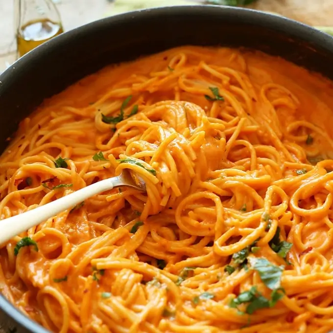 Schon habt ihr eine köstliche Pasta in wunderbar sämiger roter Paprikasauce