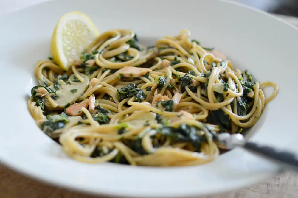 Knoblauch abziehen und fein hacken. Blattspinat verlesen, abbrausen und gut trockenschütteln. Lachsfilet ggf. häuten und in mundgerechte Stücke schneiden.