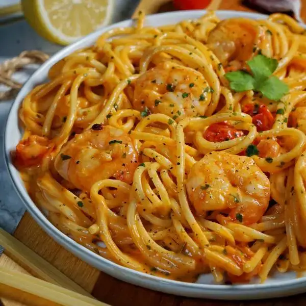 Die Garnelen in die Soße geben. Mit Salz, Pfeffer und Zitronensaft abschmecken. Den Weißwein hinzufügen und bei milder Hitze so lange ziehen (nicht kochen!) lassen, bis die auch die Nudeln fertig sind. Zum Schluss die Petersilie unter die Soße mischen.