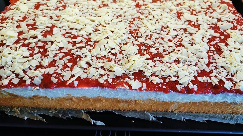 Die Erdbeeren pürieren und nach Geschmack mit Puderzucker oder Zucker süßen. Das Erdbeerpüree in Klecksen auf die Creme geben. Mit dem Spritzbeutel “Spaghetti” auf die Soße spritzen. Den Kuchen mit weißen Schokoraspeln bestreuen und anschließend kalt stellen, z. B. über Nacht.