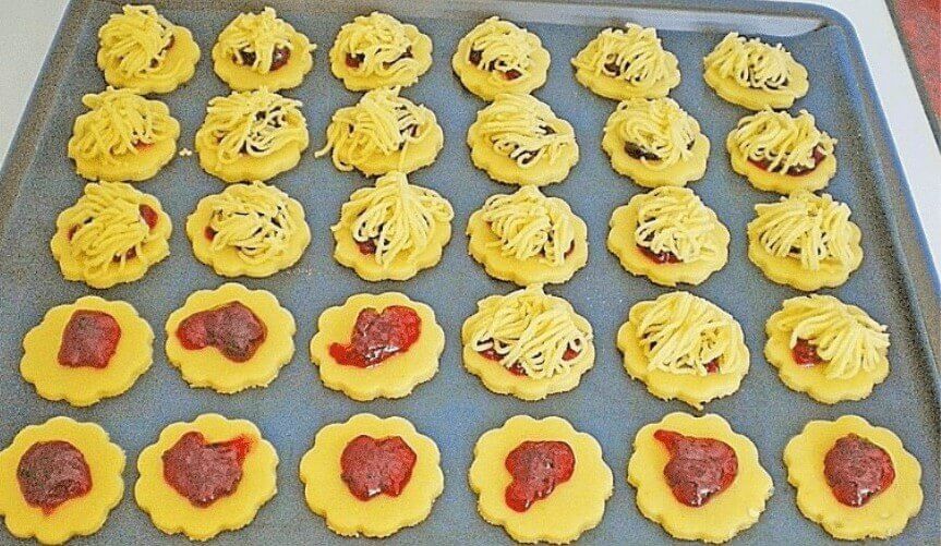2. Danach aus den Teigresten ca. walnussgroße Kugerl formen und diese durch die Knoblauchpresse direkt auf die Marmelade drauf drücken (mit Hilfe eines Messers den Teig abtrennen) und im vorgeheizten Rohr bei 180° Umluft ca. 10 bis 12 min backen – erkaltet mit Staubzucker bestreuen. Fertig!