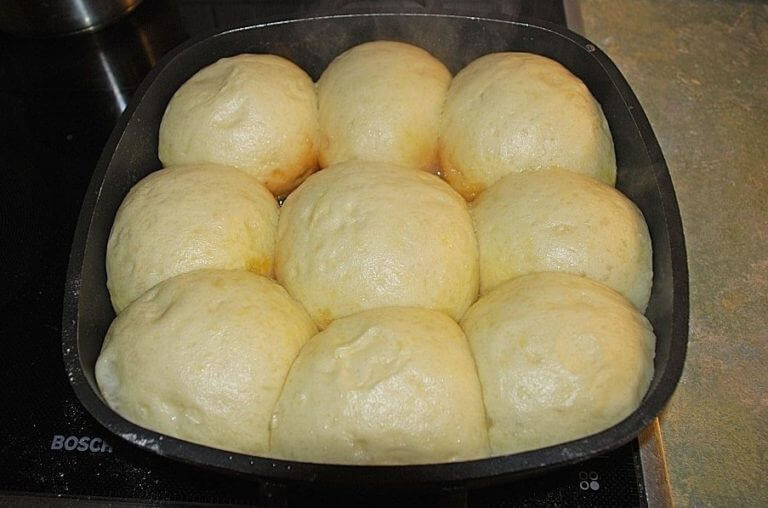 Den Teig zu einer faustdicken Rolle (Durchmesser ca. 7 cm) formen, davon ca. 9 gleich große Teile abstechen und zu runden Knödeln formen. Etwas flachdrücken und wieder gehen lassen.