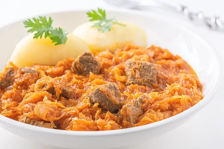 Den Speck in Würfel schneiden und auslassen. Die Zwiebel zugeben und etwa 5 Min. darin andünsten. Das Paprikapulver und das Tomatenmark zugeben und unterrühren. Nun das Fleisch hinzufügen und mit Salz und Pfeffer würzen. Das Sauerkraut auf das Fleisch geben. Alles mit Brühe übergießen und ca. 1,5 Stunden schmoren lassen.