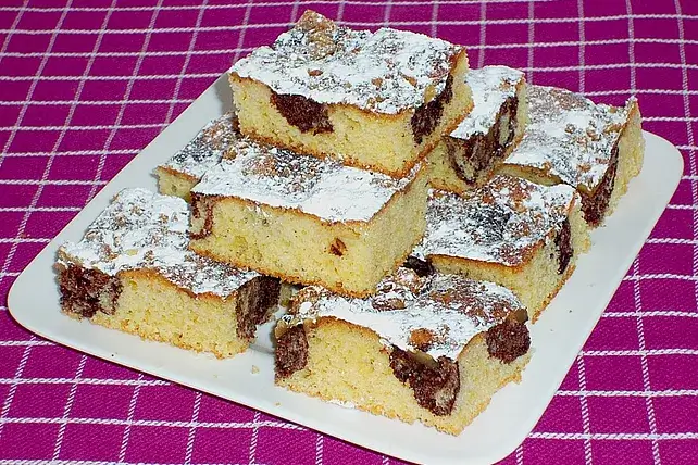 2. Jetzt 2/3 vom Teig auf ein gut gefettetes Backblech streichen. 1/3 Teig mit 3 – 4 EL Kakaopulver verrühren und mit einem Löffel kleine Häufchen auf den bereits verstrichenen Teig setzen. Nun langsam auf jedes Kakaohäufchen dann eine ½ Walnuss geben.