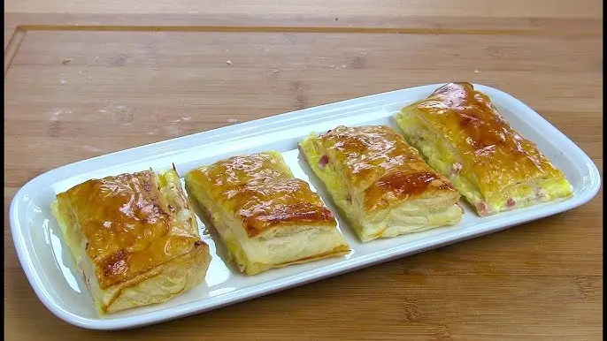 Die Blätterteigplatten auftauen lassen und halbieren. Den Schinken in kleine Stücke schneiden, mit Crème double, Crème fraîche und 150 g Gouda vermengen und mit Salz, Pfeffer und Zucker abschmecken.