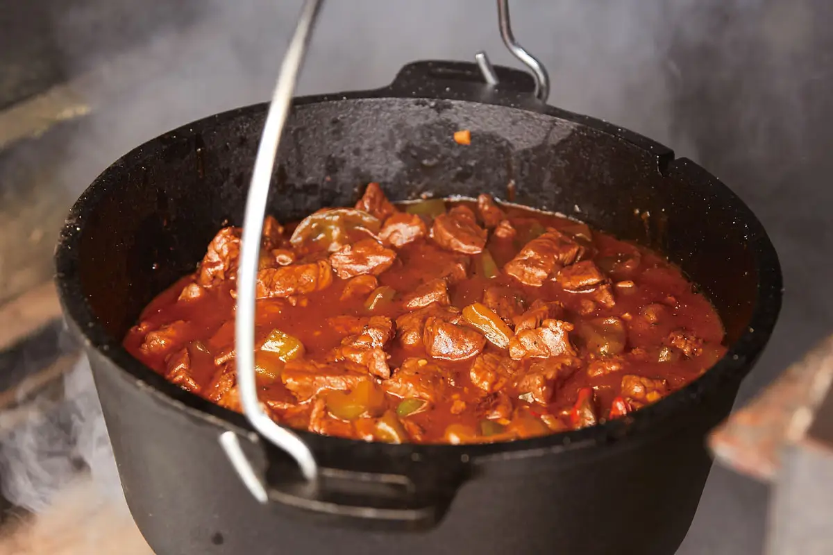Nach 60 Minuten einen guten Schuss Sonnenblumenöl (wichtig: kein Olivenöl oder ähnliches verwenden, wegen des starken Eigengeschmacks) in die Pfanne geben und das Gulasch ca. 10 Minuten bei höchster Hitze anbraten. Danach bei niedrigerer Hitze (Stufe 4, bzw. 2/3 der vollen Leistung eines Herdes) ca. 15 Minuten weiterbraten. Jetzt 500 ml Wasser in die Pfanne geben, eine Prise Kümmel und einen guten Teelöffel Brühe zugeben, alles gut verrühren und bei gleichbleibender Hitze unter gelegentlichem Umrühren ca. 40 Minuten ohne Deckel köcheln lassen, bis das Wasser vollkommen verkocht ist.