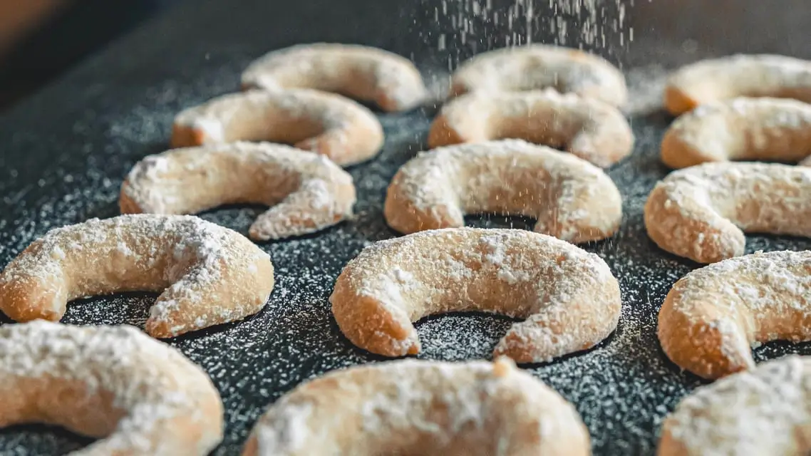 Die Kipferl nun etwa 3 Minuten kühlen lassen. Dann in die vorbereitete Puderzuckermischung legen und von allen Seiten darin wenden. Sind sie jetzt noch zu warm, zerbrechen sie sehr leicht; sind sie zu kalt, haftet der Puderzucker nicht mehr gut. Am besten immer wieder probieren, ob sie schon fest genug sind.