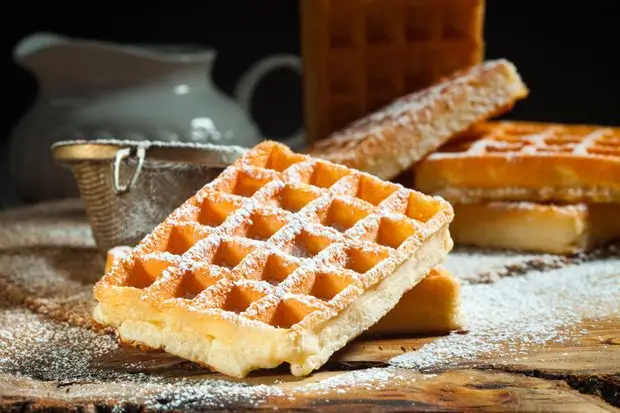 Ist die Waffel goldbraun, dann ist sie fertig und man kann sie auf einen Teller legen. Und kann sie nach Belieben mit Puderzucker oder heißen Kirschen servieren.