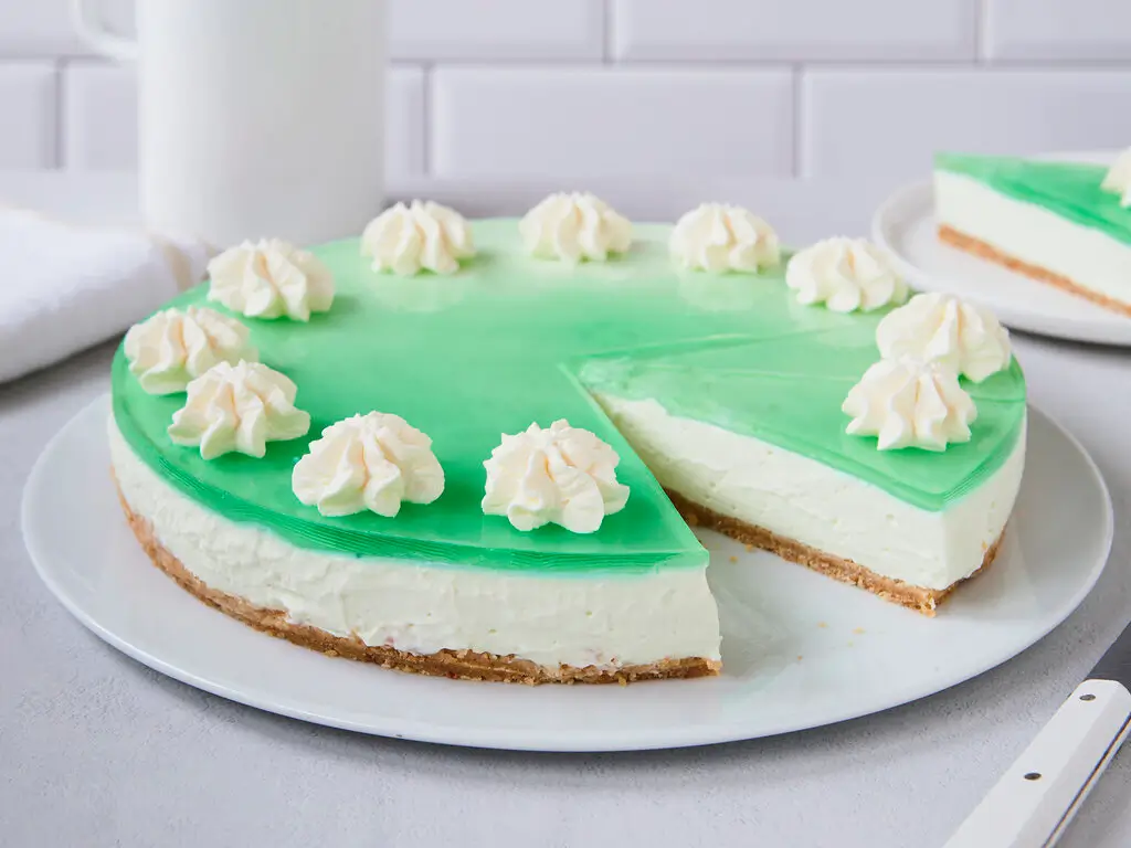 Den Wackelpudding nun mit der Frischkäse – Sahne – Mischung verrühren und das Ganze auf den Boden geben. Bis zum Verzehr für ca. 1 Stunde in den Kühlschrank stellen damit die Torte fest werden kann.