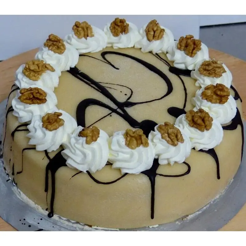 Den unteren Rand mit den gehackten Walnüssen verzieren. 100 g Sahne steif schlagen, in einen Spritzbeutel mit Sterntülle füllen und die Torte mit Tuffs verzieren. Die sechs Walnusskerne halbieren und jeweils eine Hälfte auf einen Tuff setzen. Die Torte bis zum Servieren kaltstellen.