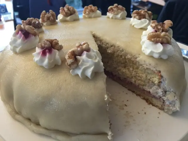Den unteren Rand mit den gehackten Walnüssen verzieren. 100 g Sahne steif schlagen, in einen Spritzbeutel mit Sterntülle füllen und die Torte mit Tuffs verzieren. Die sechs Walnusskerne halbieren und jeweils eine Hälfte auf einen Tuff setzen. Die Torte bis zum Servieren kaltstellen.