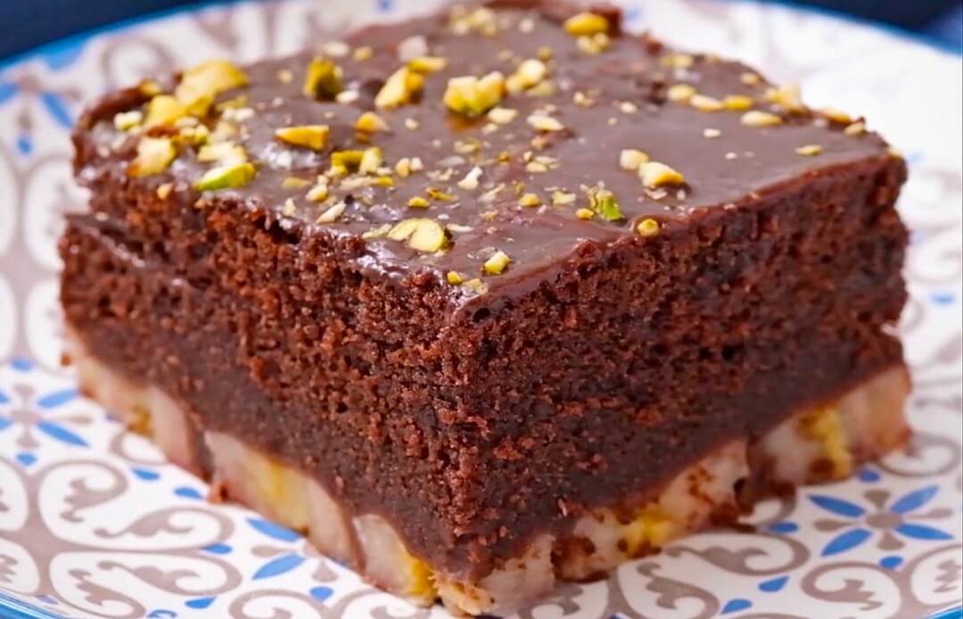 Den Kuchen in Quadrate schneiden und mit Schokoladenflocken und Kakaopulver dekorieren.