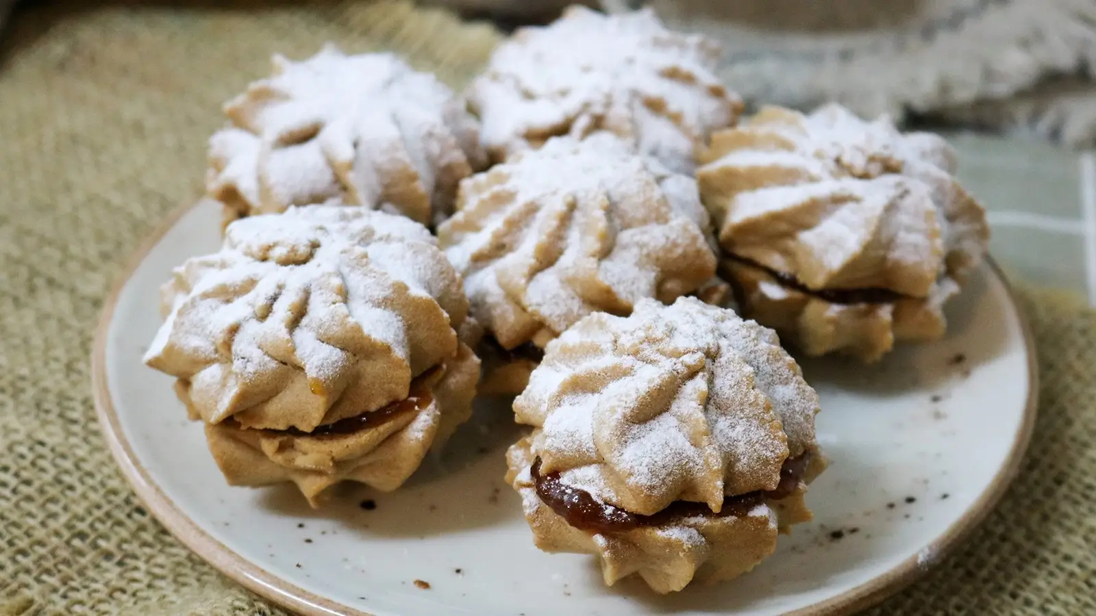 5. Um die Füllung zu machen, schlagen Sie die Butter, Puderzucker und Vanille glatt. Streuen Sie einen halben Teelöffel Marmelade auf die Hälfte der Kekse und verteilen Sie die Buttercreme auf die andere Hälfte. Vorsichtig zusammendrücken und mit leichtem Puderzucker bestäuben.