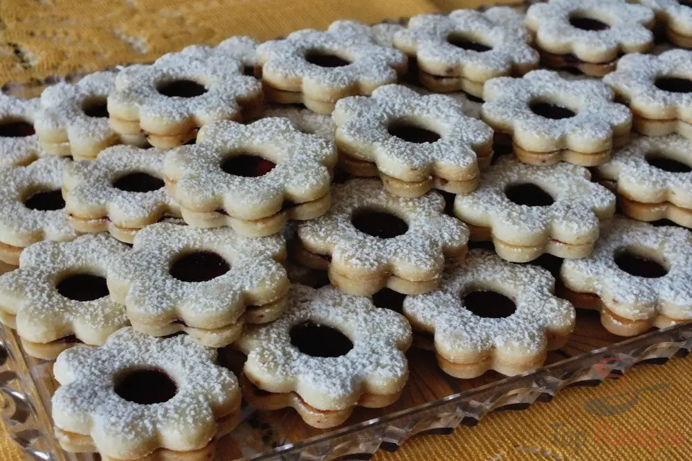 Die Plätzchen mit Marmelade zusammenkleben und mit Puderzucker bestäuben.