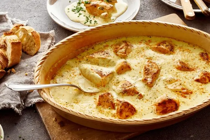 Inzwischen aus Sahne, Milch, gekörnter Brühe, dem Frischkäse und falls vorhanden, frischen Gartenkräutern (z. B. Petersilie), eine Soße anrühren. Diese wird dann über die Filets gegeben und das Ganze weitere 15 Minuten im Rohr gegart.