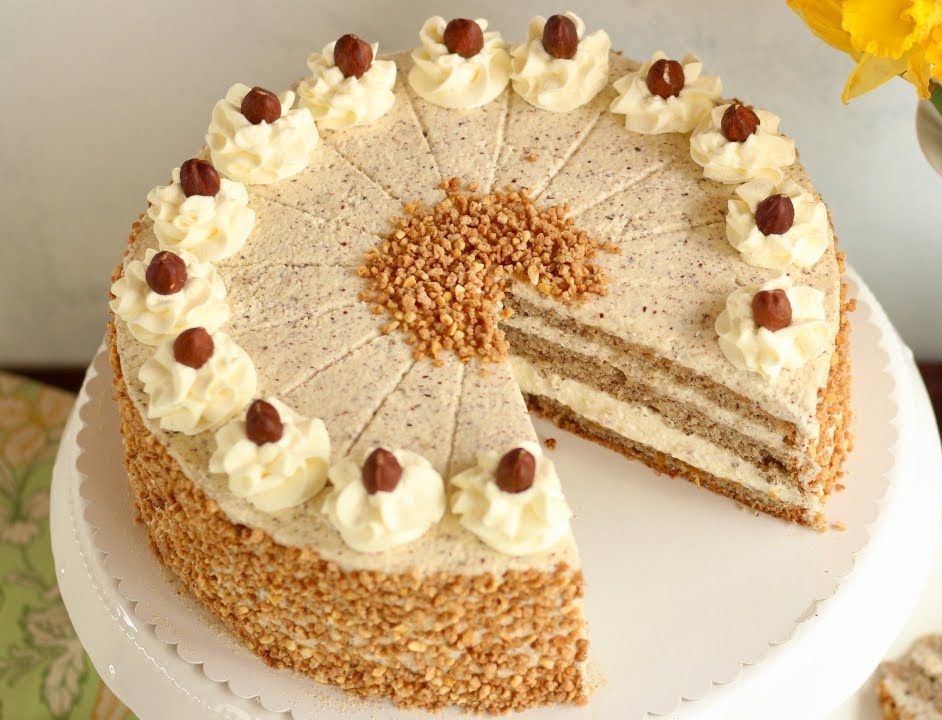 Die Sahne steif schlagen und die gemahlenen Haselnüsse unterrühren. Einen Boden in einen Tortenring legen, mit der Nussnougatcreme bestreichen. Ein Drittel der Sahne-Nuss-Mischung draufgeben und glatt streichen. Den zweiten Boden aufsetzen, mit der Himbeermarmelade bestreichen und ein weiteres Drittel der Sahne-Nuss-Füllung draufgeben, glattstreichen. Den dritten Boden aufsetzen, die restliche Sahnefüllung glatt aufstreichen. Einige Stunden kalt stellen.