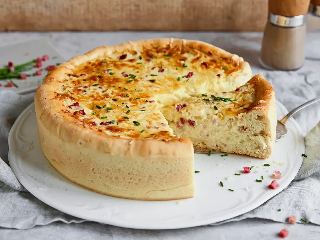 Den Belag dann in die mit dem Teig ausgelegte Kuchenform geben und anschließend noch mit dem geräucherten Schinken und dem Kümmel bestreuen. Abschließend noch einige Butterflocken darauf geben.